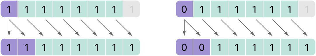 下の図は、11111111 << 1(11111111 を 1 桁左にずらしたもの)と 11111111 >> 1(11111111 を右に 1 桁ずらしたもの)の結果を示しています。青色の数字はシフトされ、灰色の数字は破棄され、オレンジ色の空きには 0 が挿入されます。