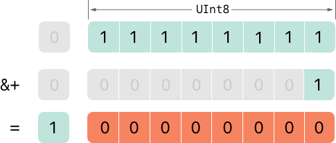 オーバーフロー加算演算子(&+)を使用して、符号なし整数を正の方向にオーバーフローさせた場合の例を次に示します: